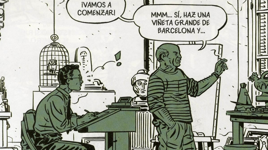 De esta manera da comienzo la primera de las historias que nos presenta este cómic, el de la construcción conjunta (entre Marcel y Picasso) de un tebeo en el que este último interviene en la Guerra “para pegarle un tiro a Franco”. Esta primera parte se hace fuerte en la construcción de la historia y la proyección de los personajes principales, en un juego constante de espejos entre ambos: un genio en edad avanzada que re resiste a acabar sus obras, porque lo considera un paso más hacia la muerte, y que su vez mantiene el fuego interior de la rabia que le provoca no ser valorado como en sus mejores tiempos, con el joven meticuloso que hace ver al otro los pasos que debe seguir un trabajo como el que están haciendo. El desarrollo de los personajes y su relación de amistad, basada en constantes encuentros y desencuentros, entre ambos creadores es verdaderamente redonda, y no revelaré más detalles, para que os animéis a leerla.