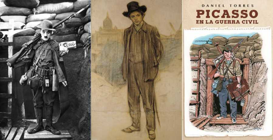 Y ya que hablamos del estilo pictórico de la obra, es necesario que hagamos una breve parada en su portada, en la cual tenemos una fusión entre el famoso cartel de ‘¡Armas al hombro!’, de Chaplin y un retrato de Pablo Picasso pintado por Ramón Casas a principios del siglo XX, que Daniel Torres acabará de rematar con la estética propia del miliciano republicano.