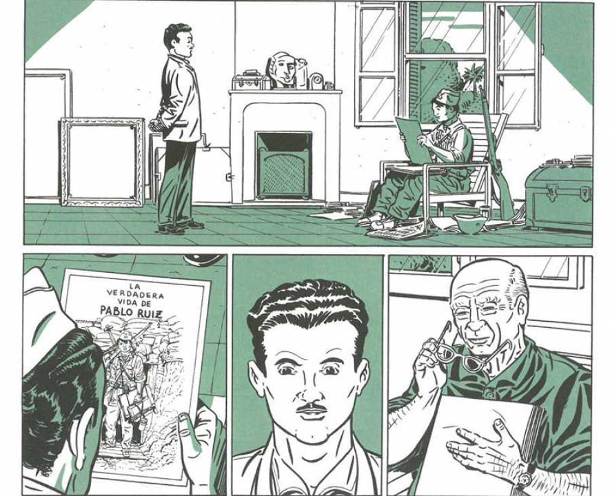 A mediados de la novela, pasaremos al siguiente nivel de la narración, que supone al cómic en sí que han elaborado Marcel y Picasso, llamado “La Verdadera Vida de Pablo Ruiz”, donde tendremos a un Picasso de 25 años en pleno 1938 en Barcelona, deseando participar en el conflicto bélico. Pero conoceremos al protagonista como Pablo Ruiz, dibujante de historietas, que realiza trabajos de cartelería y propaganda para el bando republicano, y no un pintor mundialmente famoso y rico. De hecho, firmará sus obras como “Pegasso” porque nadie sabe decir bien su verdadero nombre. La Barcelona de las trincheras y también de la alegría en mitad del sufrimiento de la guerra está magníficamente retratada, incluyendo a las señoritas de Aviñón y a los amigos de Pablo Picasso: Carles Casagemas y Jaume Sabartés, así como a Georges Braque, al que conocerá en el frente.