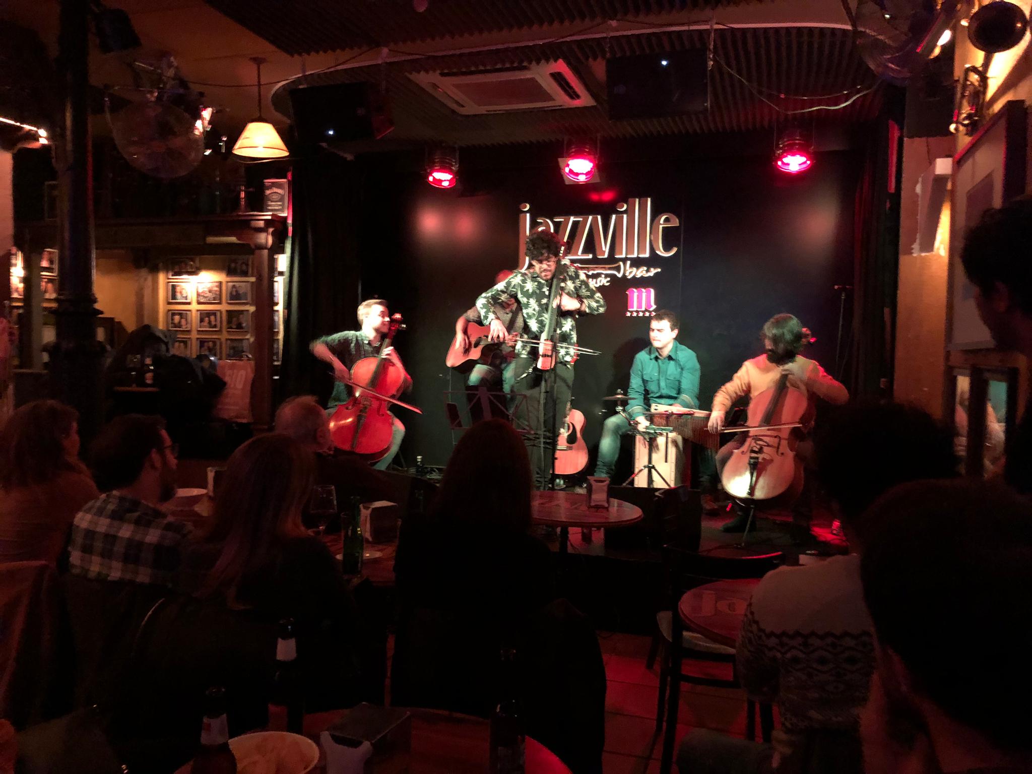 Y por fin llegó el día. Reunidos en la sala Jazzville de la calle Jesús Aprendiz 19, en Madrid, el grupo Chelo Submarine y el solista Dave America empezaron su show.