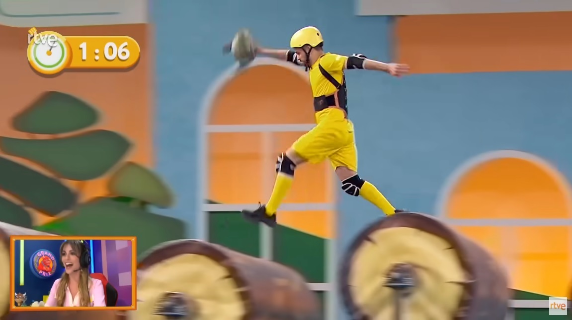 El programa empezó con una breve y nostálgica introducción, que me hizo pensar que fueran a liarla. Pero no. Durante sus más de dos horas de duración, el regreso del “Grand Prix” fue bestial. No iba de desbloquear un recuerdo de la infancia. Eso ya lo hace Youtube. Se trataba de hacerte disfrutar. Se mezcló muy bien su esencia con elementos actuales, como hacer cabeceras de las pruebas con graciosos rótulos y animaciones en 8 bits (al estilo NES), mientras el presentador las explicaba. Esto no solo queda genial ahora; también podría serlo hace 20 años, porque aquellos ballets de chicas en bañador al ritmo de cutres canciones ya me parecían ridículos cuando peque.