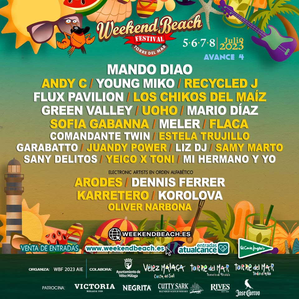 Weekend Beach Festival Torre del Mar, que se celebrará del 5 al 8 de julio de 2023 en una de las playas con más calidad medio ambiental, accesible y más atractivas de la costa de Málaga, tiene un cartel imponente con importantes artistas internacionales y nacionales como MALUMA, EDITORS, CARL CRAIG, DELLAFUENTE, SFDK, FANGORIA, SIDECARS, JORIS VOORN, LA CASA AZUL, CHEF´SPECIALS, HECTOR OAKS, TARRUS RILEY, MALA RODRIGUEZ, KIKO VENENO, DANI FERNÁNDEZ, MORGAN, RAULE, SUNNERY JAME & RYAN MARCIANO, CERA KHIN, FATIMA HAJJI, DELAOSSA, FARRAGO, MARC SEGUÍ, ALEX KENNON, ROSA PISTOLA, MUERDO, DOCTOR EXPLOSION, MIGUEL BASTIDA, NARCO, THE GULPS, DREMEN, LA REGADERA y muchos más.