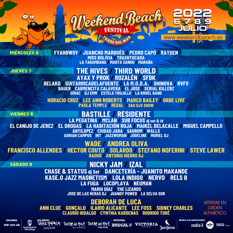 Weekend Beach Festival comienza la cuenta atrás para su edición más esperada. Del 6 al 9 de julio en la playa de Torre del Mar, en pleno corazón de la Costa del Sol, en Málaga, los weekers volverán a su reencuentro con el festival. Una cita con muchos estilos musicales que confluyen en un evento sin etiquetas, desde el rock, el pop, el rap, ritmos urbanos, latina, fusióny mestizaje, reggae, electrónica y mucho baile, divididos en cuatro escenarios dotados del mejor sonido, un recinto con todas las comodidades y accesibilidad, zona de acampada junto al recinto del festival, zona gastronómica, zoco, parking. Pero Weekend Beach Festival no es solo música, es disfrutar del mejor momento, de la playa, del verano, la gastronomía y el sol. Un pack difícil de mejorar.
