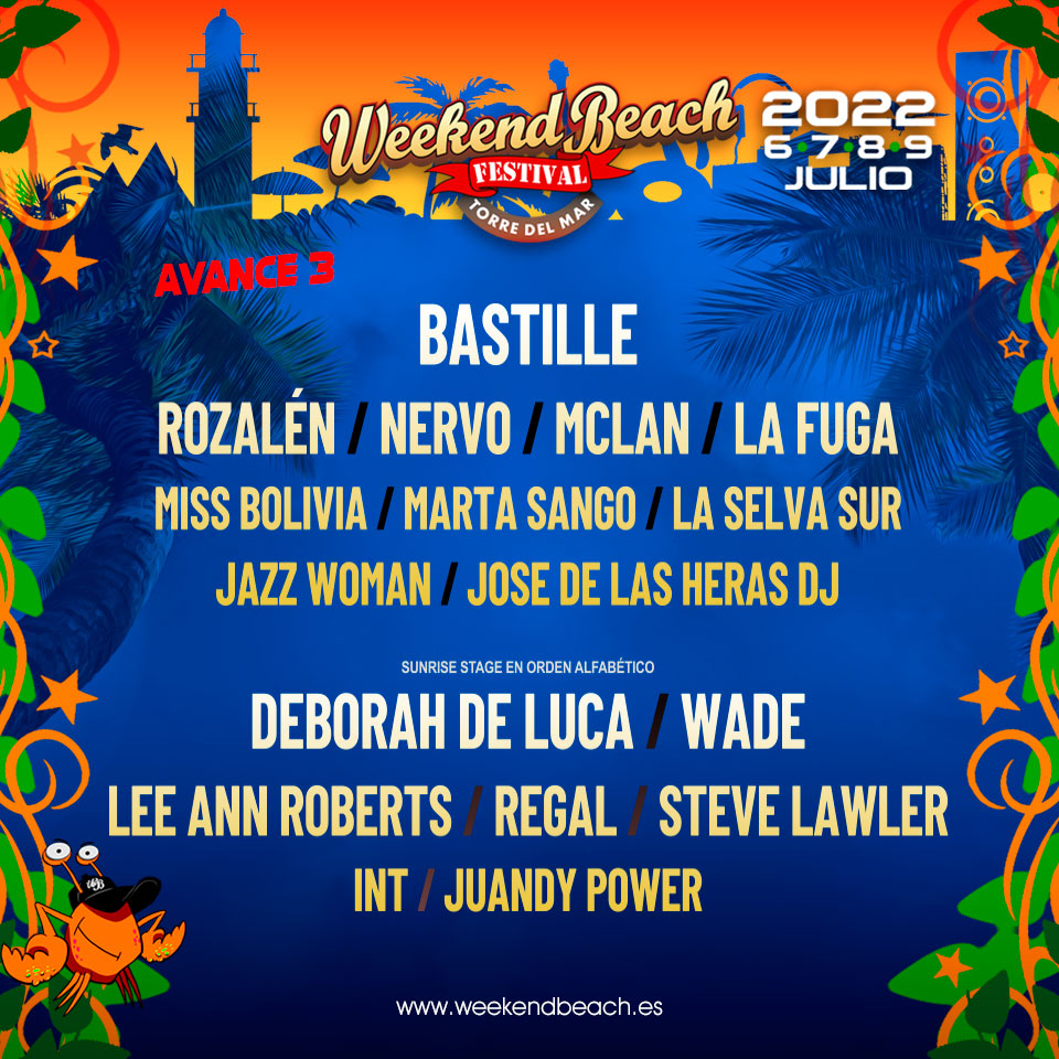 Un completo programa de artistas para esta nueva edición de Weekend Beach, con una contratación que supera una inversión de dos millones de euros, donde destaca la presencia femenina del cartel con nombres como Nervo, Rozalén, Lola Índigo, Deborah de Luca, Anne Clue, Belako, The Lizard, Miss Bolivia, Trashtucada, Estela Trujillo, Marta Rango, Carmencita, etc.